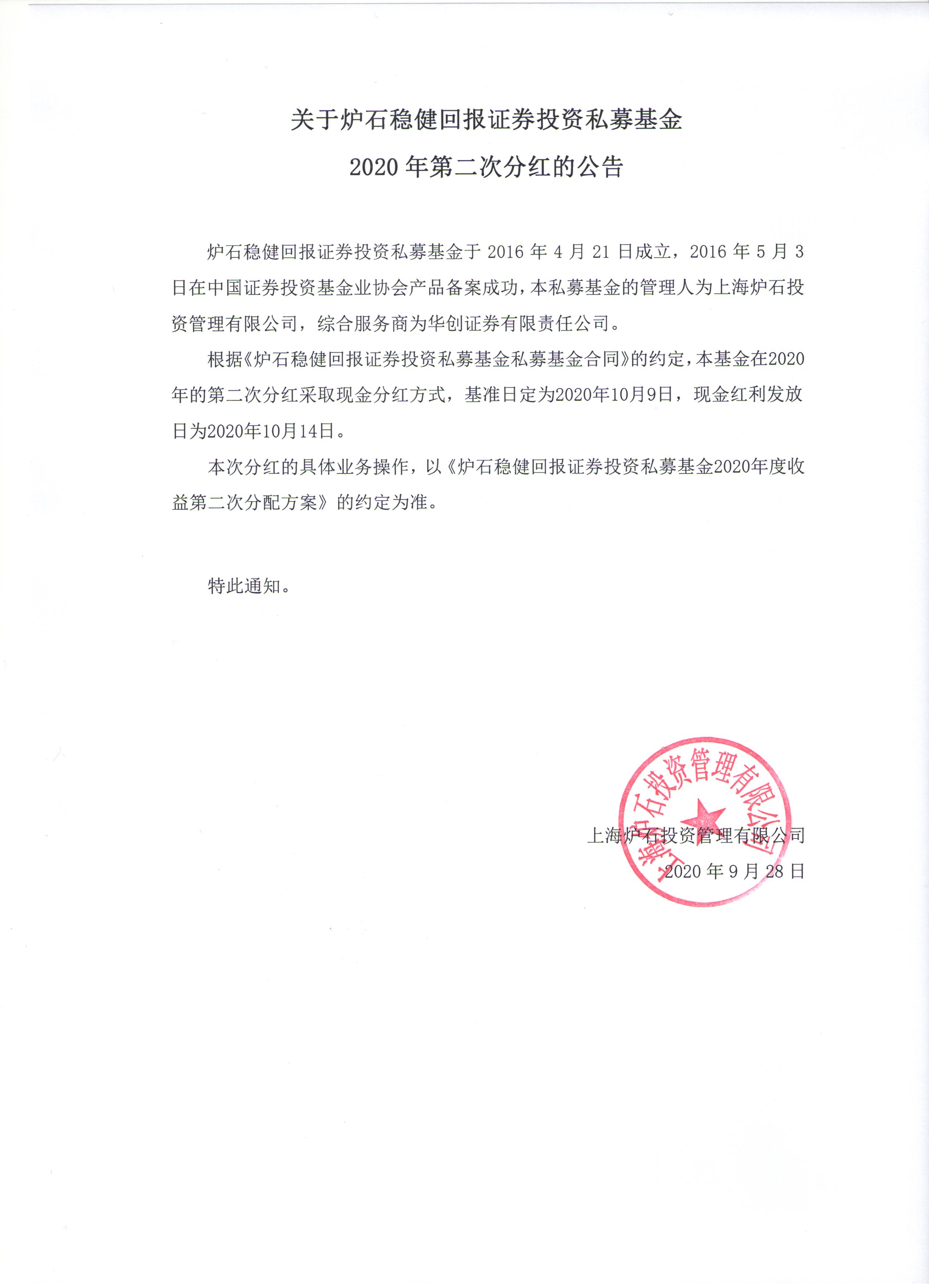 炉石稳健回报证券投资私募基金2020年第二次分红公告